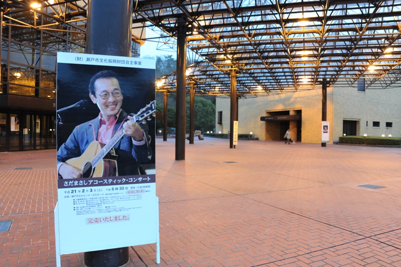 久しぶりに会場でさだまさしコンサート用のポスターを見ました。 以前はコンサート用のポスターを会場で見かけたことがあるのですが、最近はあまり見た記憶がありません。 通常のコンサートだと、愛知県や岐阜県の東海地区は東海ラジオが間に入るのですが、今回のアコースティックコンサートは東海ラジオは関係無く、会場で直接販売したようです。 そもためか、瀬戸市文化センターがポスターを用意したのかもしれません。 帰りはいつものように曲目の一覧が貼られていました。 現在まだツアー中のため曲目のところは伏せましたが、曲目の一覧がこうやって帰りに見れると便利ですね。 以前のように携帯電話のカメラやデジカメが普及していないときに、こういった曲目が貼られると、メモをする人で混乱したでしょうが、今は携帯のカメラ等で簡単に撮影できて便利です。